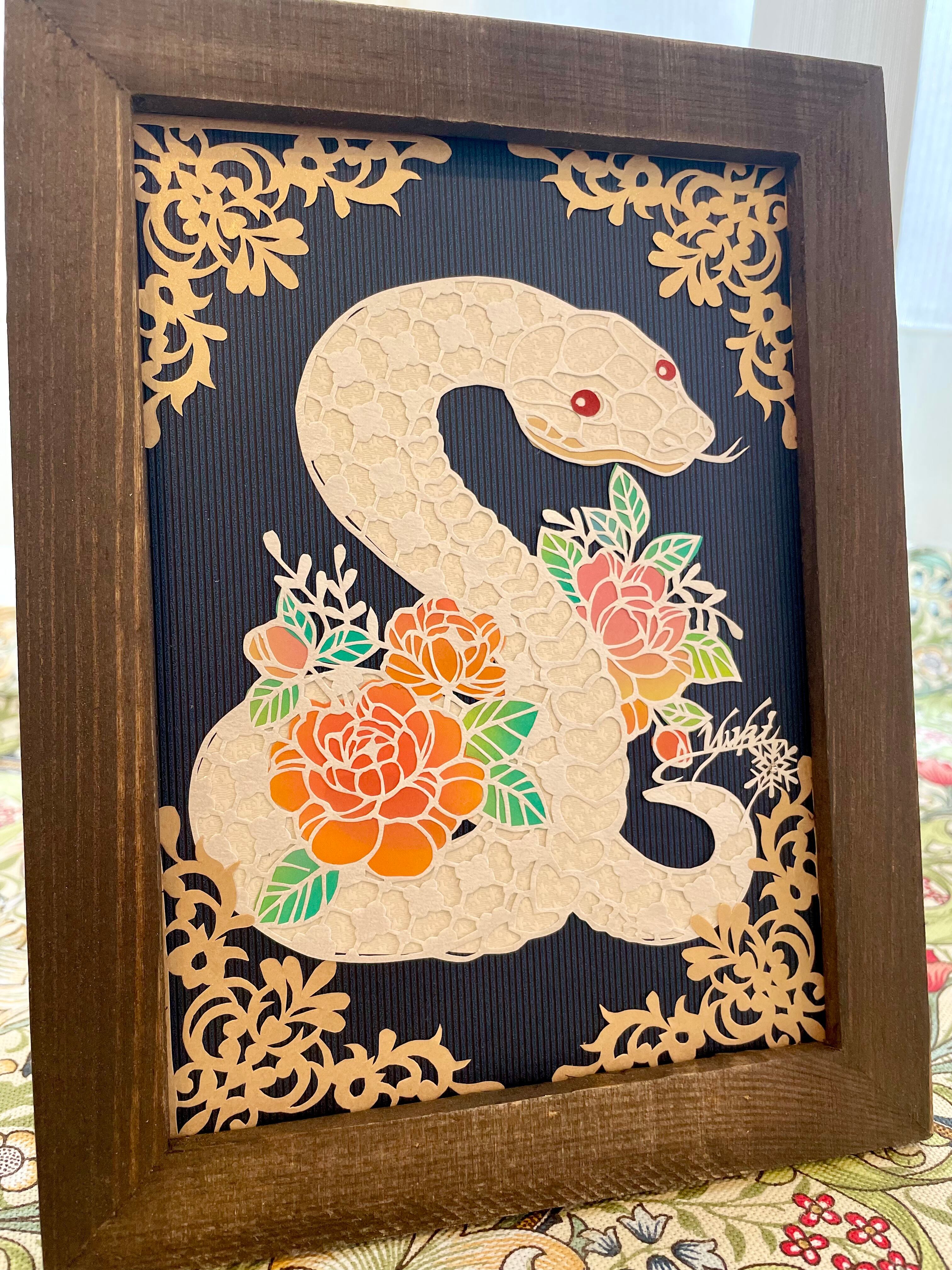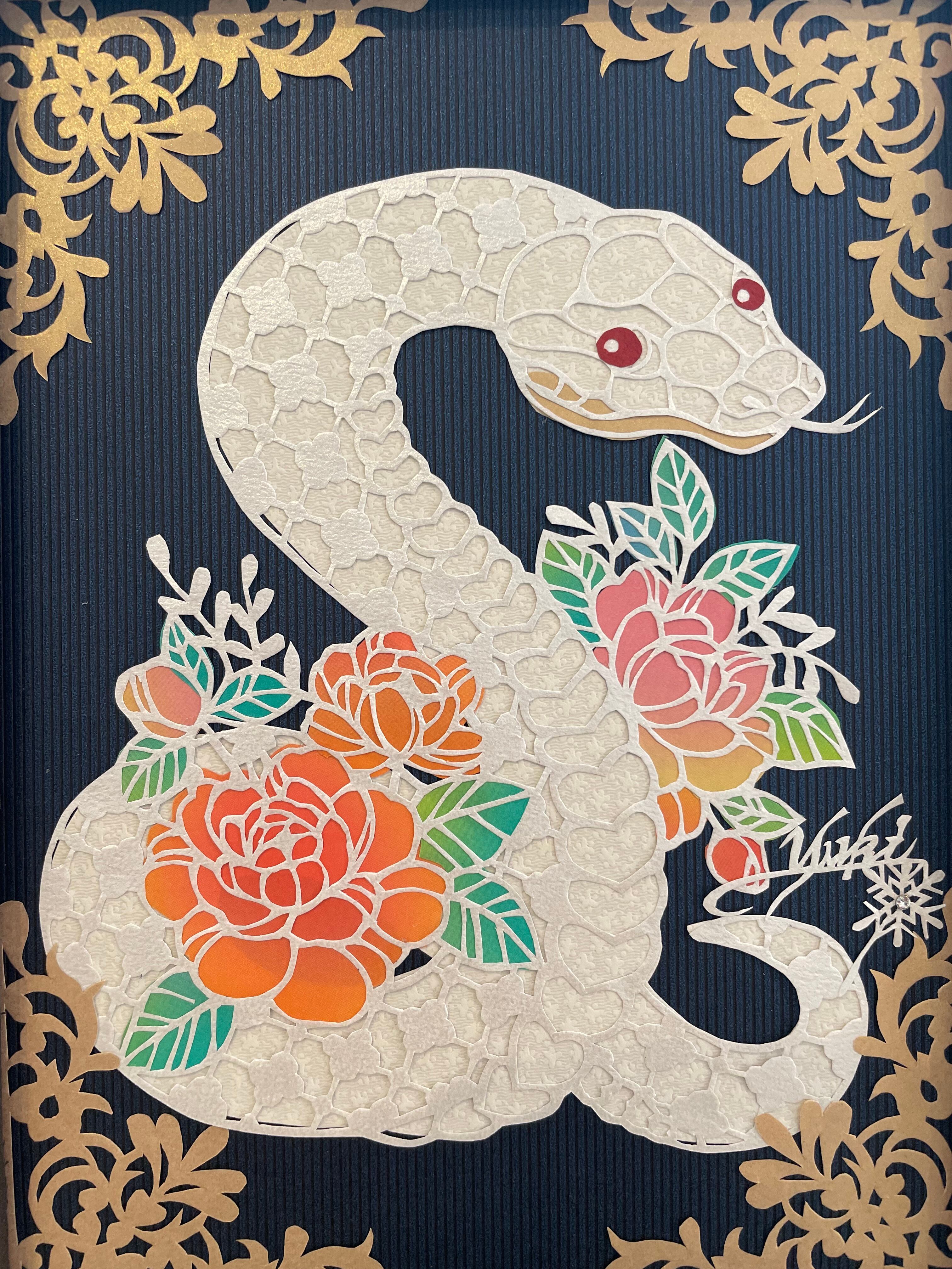 2025年は巳年です。愛らしい白ヘビさんと薔薇のお花を組み合わせました。白蛇さんは弁財天の使いとされ、とても縁起のよいヘビさんです。